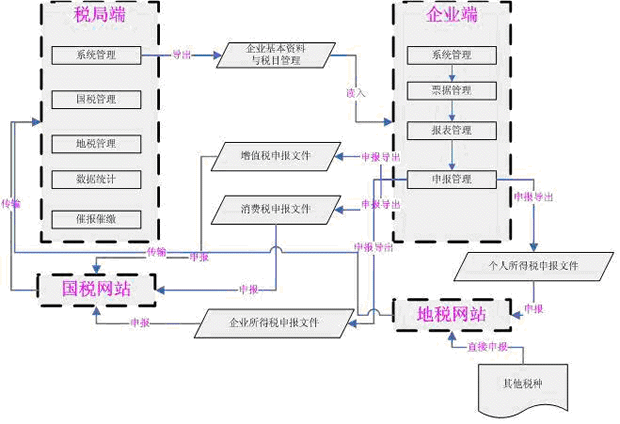 电子报税教学系统可以分为四个子系统:电子报税——企业端子系统、电子报税——税局端子系统、电子报税——国税网站、电子报税——地税网站。税局端的主要功能模块包括系统管理、国税管理、地税管理、催报催缴和数据统计;企业端的功能模块包括系统管理、票据管理、报表管理和申报管理。企业端的企业基本资料除几个可以修改的资料之外均须通过读取从税局端——系统管理导出企业基本资料文件获得的,企业基本税目信息也必须在税局端设置;国税网站与地税网站是为企业提供申报平台,模拟企业通过网络直接报税。教师在组织学生实习时,可以按照不同纳税人的不同税种组织模拟实习,也可以按照不同税种的不同纳税人组织模拟实习。