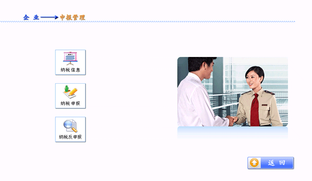 企业端模拟企业使用的电子报税系统由系统设置、票据管理、报表管理、纳税申报、帮助模块组成。系统设置主要是对用户的管理、企业基础资料的管理以及数据备份、恢复,票据管理主要是对企业影响税金的各种票据的归类与录入,也是申报的原始依据。报表管理是系统根据录入的票据自动生成各类申报报表以及对企业所得税申报附表的管理。纳税申报是对电子报税系统中报表数据实施申报。